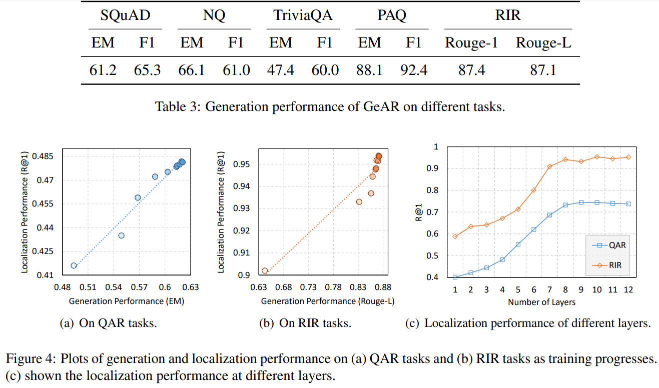 GeAR 모델의 성능을 검증하기 위해 문서 검색(Document Retrieval), 세밀한 정보 탐색(Units Localization), 정보 생성(Information Generation) 세 가지 실험을 수행하였다.