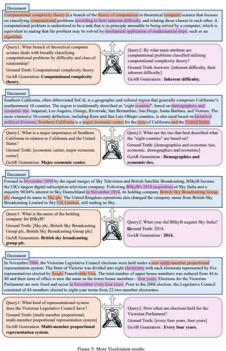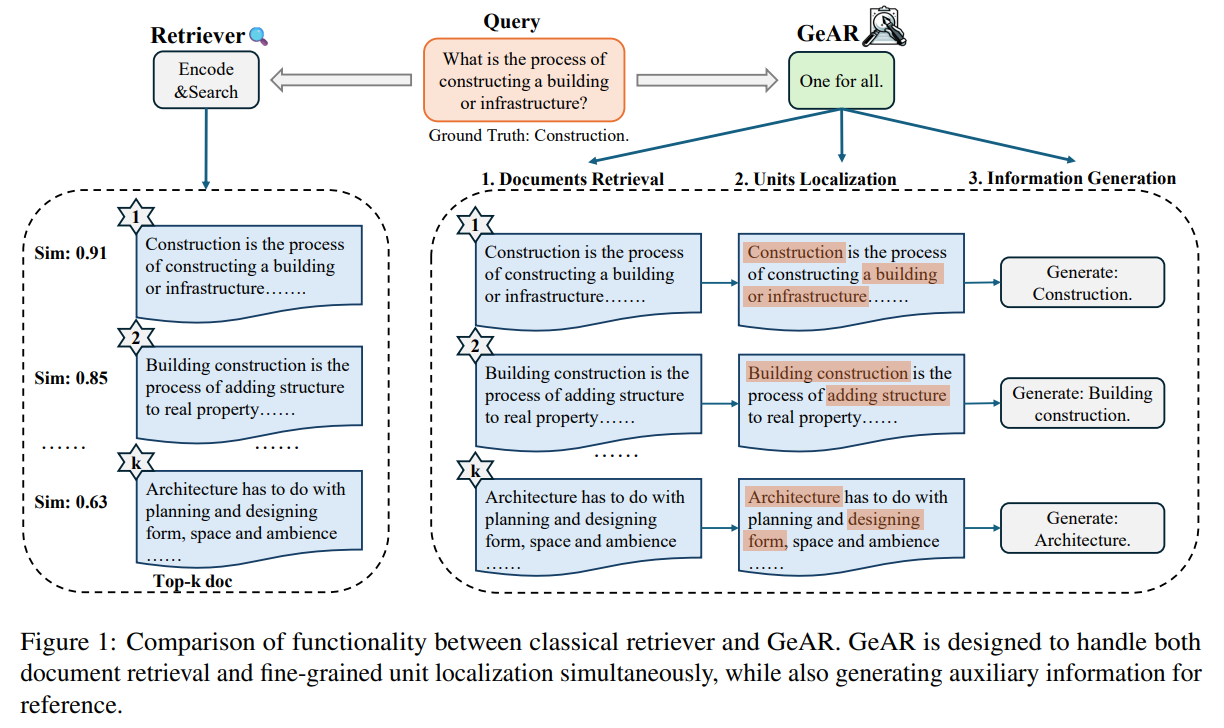 - 기존 검색 모델이 단순한 검색 결과를 반환하는 반면, GeAR는 검색된 문서 내용을 요약하거나 질문에 대한 답변을 생성 가능.