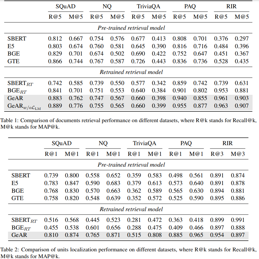 - GeAR는 기존 검색 모델(SBERT, E5, BGE)보다 우수한 성능을 달성.