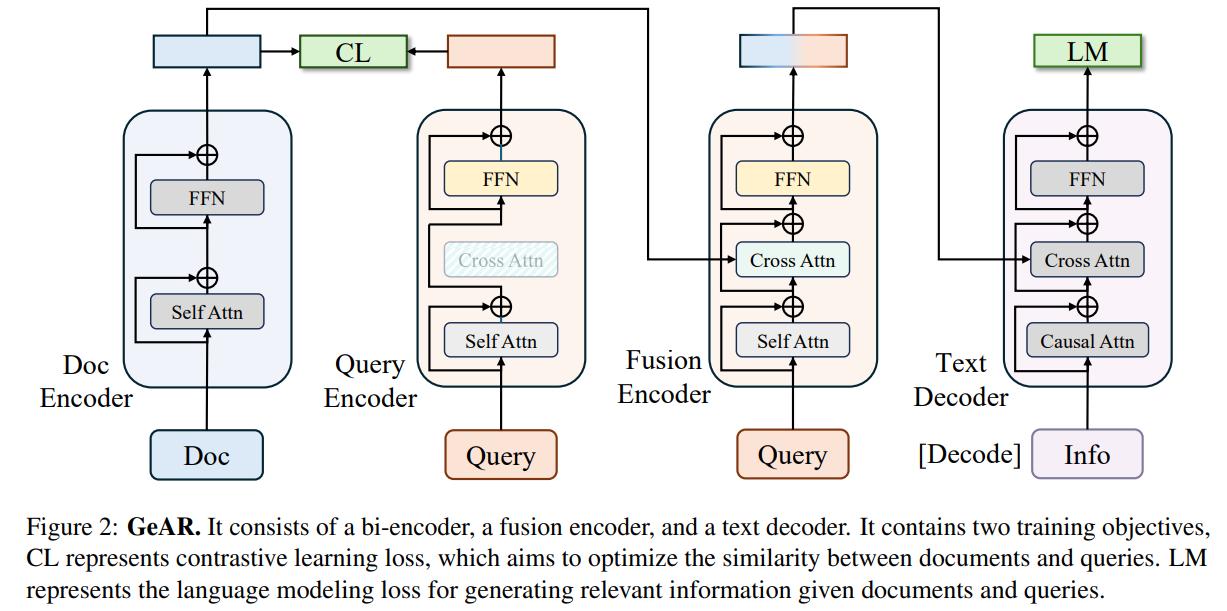 | 🔍 모델 구성 | GeAR는 3가지 주요 모듈로 구성됨. ✅ Bi-Encoder → 쿼리와 문서를 각각 벡터화하여 검색 수행 (기본 검색 기능). ✅ Fusion Encoder → 문서 내에서 쿼리와 가장 관련된 문장을 찾아 강조 (세밀한 정보 탐색). ✅ Text Decoder → 검색된 문서에서 관련 내용을 요약하거나 직접 생성 (정보 생성). |