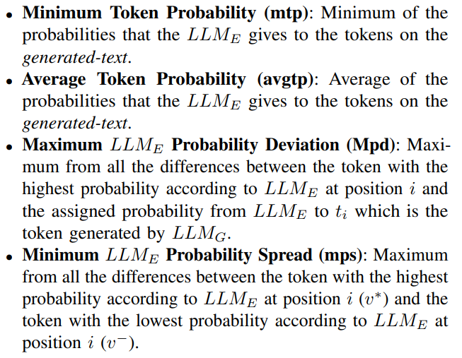 - 본 논문에서도 Lee et al.(2023)의 연구를 참고하여 최소 토큰 확률(mtp)과 평균 토큰 확률(avgtp)을 주요 특징으로 선정.