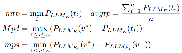 - 최대 LLME 확률 편차(Mpd): LLME가 예측한 가장 높은 확률과 LLMG가 생성한 토큰 확률의 차이