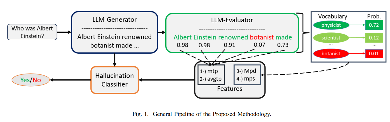 | 📌 연구 배경 | - LLM(Large Language Model)은 종종 환각(hallucination) 현상을 보이며, 이는 사실과 다른 정보를 생성하는 문제를 초래함. - 특히 ChatGPT, GPT-3, Claude 2 같은 모델이 생성하는 텍스트에서 환각이 빈번하게 발생. - 기존의 환각 탐지 방법은 고비용, 고차원적 특징 사용, LLM 내부 상태(hidden states) 의존, 동일한 모델을 평가자로 사용하는 한계를 가짐. |