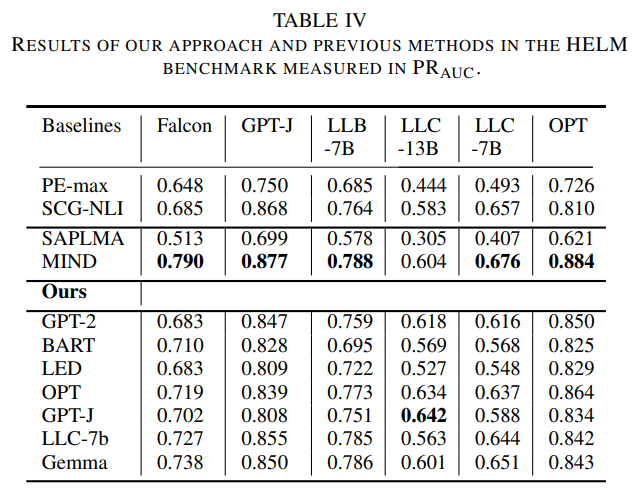 - MIND (기존 최첨단 모델)보다 일부 태스크에서 성능이 낮았으나, SAPLMA, SelfCheckGPT 등보다 우수