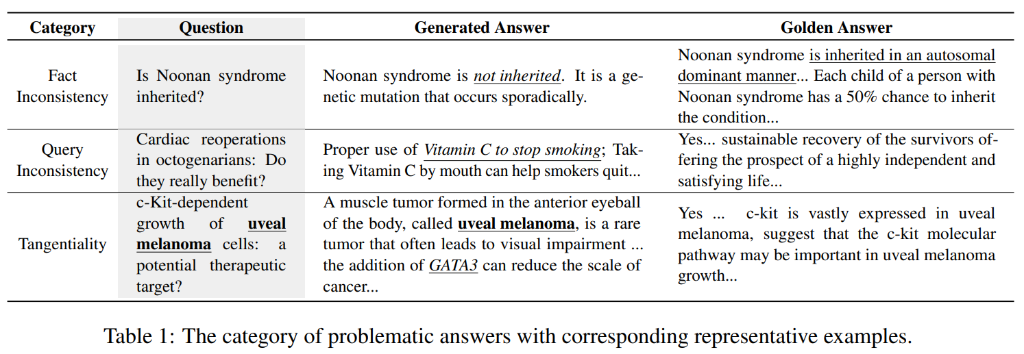 | 🧪 실험 설정 | - ✅ 5개 의료 QA 데이터셋 사용 (PubMedQA, MedQuAD, MEDIQA2019, LiveMedQA2017, MASH-QA) - ✅ 5개 LLM 평가 (Vicuna-7B, Alpaca-LoRA-7B, ChatGPT, MedAlpaca-7B, Robin-medical-7B) - ✅ 자동 평가: Med-NLI, CtrlEval, F1, ROUGE-L - ✅ 인간 평가: Fact Inconsistency(사실 오류), Query Inconsistency(질문 불일치), Tangentiality(주제 일탈) |