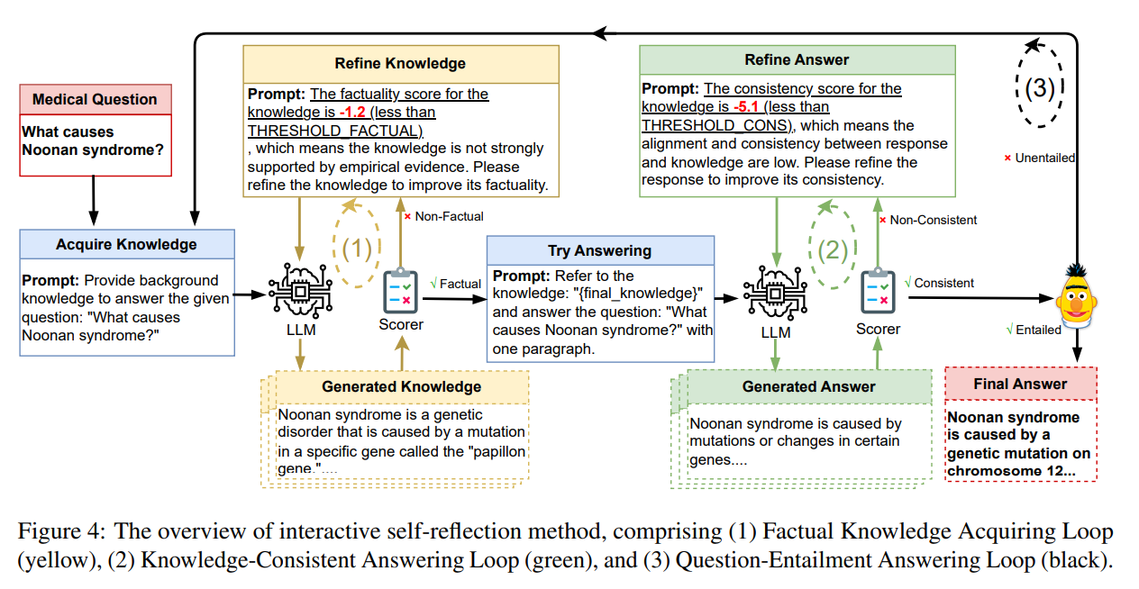 | 🔬 제안 방법론 | ✅ 자기 반성 루프(Self-Reflection Loops) 도입하여 반복적 피드백(Generate-Score-Refine) 구조 적용 1️⃣ 사실적 지식 획득 루프 (Factual Knowledge Acquiring Loop) - 질문을 기반으로 배경 지식 생성 → 사실성 평가(Factuality Scoring) 수행 → 점수가 낮으면 자체 수정 - 예: Noonan Syndrome 원인을 설명할 때 **잘못된 유전자 정보(PTEN)**를 포함하면, PTPN11, KRAS 등으로 수정 2️⃣ 지식 일관성 유지 루프 (Knowledge-Consistent Answering Loop) - 배경 지식을 바탕으로 답변 생성 → 지식과의 일관성 평가 수행 → 모순되면 수정 - 예: "Noonan Syndrome은 유전되지 않는다." → 사실 오류 발생 → "Autosomal dominant inheritance"로 수정 3️⃣ 질문 함의 평가 루프 (Question-Entailment Answering Loop) - 생성된 답변이 질문과 논리적으로 일관된지 평가(Entailment Scoring) → 부족하면 다시 수정 - 예: "Who can get eczema?" 질문에 "A. 10%, B. 20%..." 같은 응답 생성 시 → 의미 불일치 → "Anyone can get eczema, but it is more common in children and those with a family history."로 수정 |