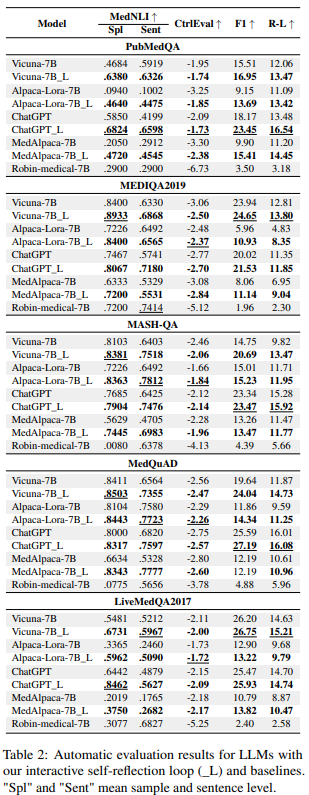 - 자동 평가에서도 Med-NLI, CtrlEval 점수가 전반적으로 향상되었으며, 이는 자기 반성 루프가 환각을 줄이고 더 신뢰할 수 있는 답변을 생성하는 데 효과적임을 시사한다.
