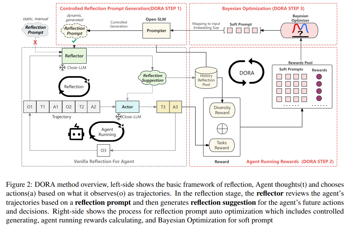 DORA (Dynamic and Optimized Reflection Advice)는 기존의 정적인 프롬프트 대신 작업에 적응하고 동적으로 변화하는 반영 프롬프트를 생성하는 방법을 제안한다.