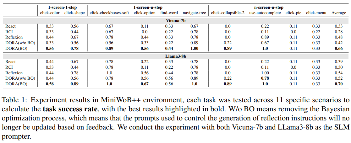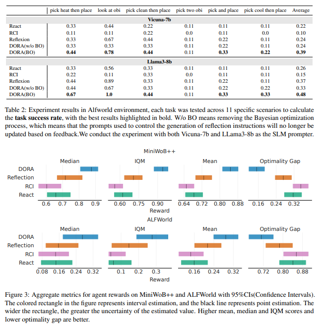 DORA의 성능을 평가하기 위해 MiniWoB++ 및 Alfworld 환경에서 실험을 수행하였다.