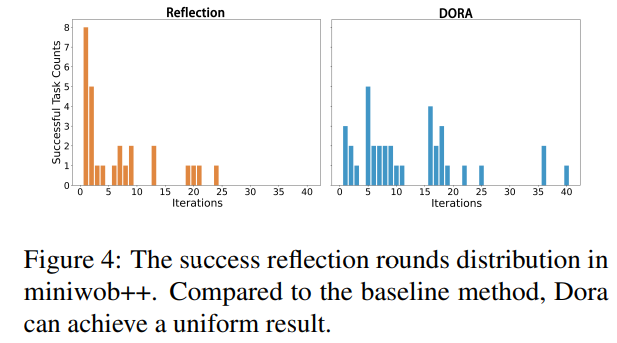 기존 Reflection은 초반 Iteration에서 효과가 있었지만 DORA는 반복이 진행될 수록 성능이 지속적으로 향상된다.