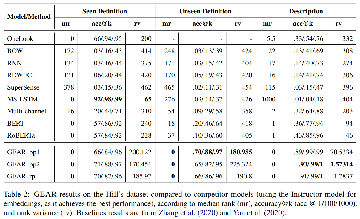 - GEAR는 사전에서 단어를 찾아내는 것이 주 목적이지만, Dict-BERT와 같은 연구는 단어 의미를 보다 정교하게 학습하는 것이 목표.