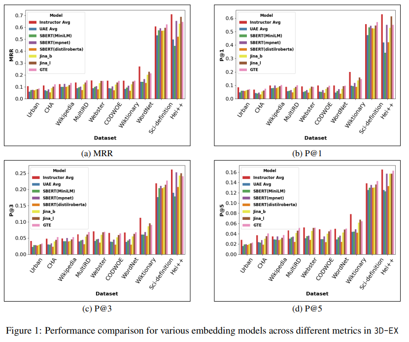 - 특히 과학 용어(Sci-definition)나 전문 용어(Hei++ 데이터셋)에서는 높은 성능을 기록했지만, 비공식적 표현(Urban Dictionary)에서는 상대적으로 성능이 저하되었습니다.