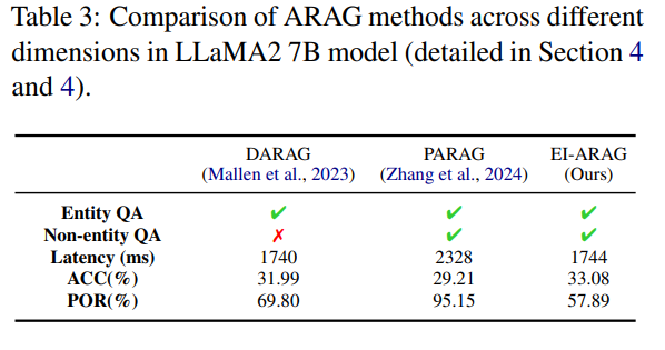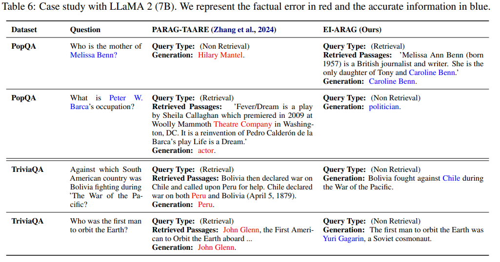 - EI-ARAG는 검색이 필요할 때만 검색 수행 → LLM이 이미 알고 있는 질문에 대해서는 검색하지 않음.