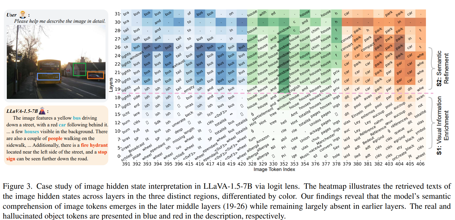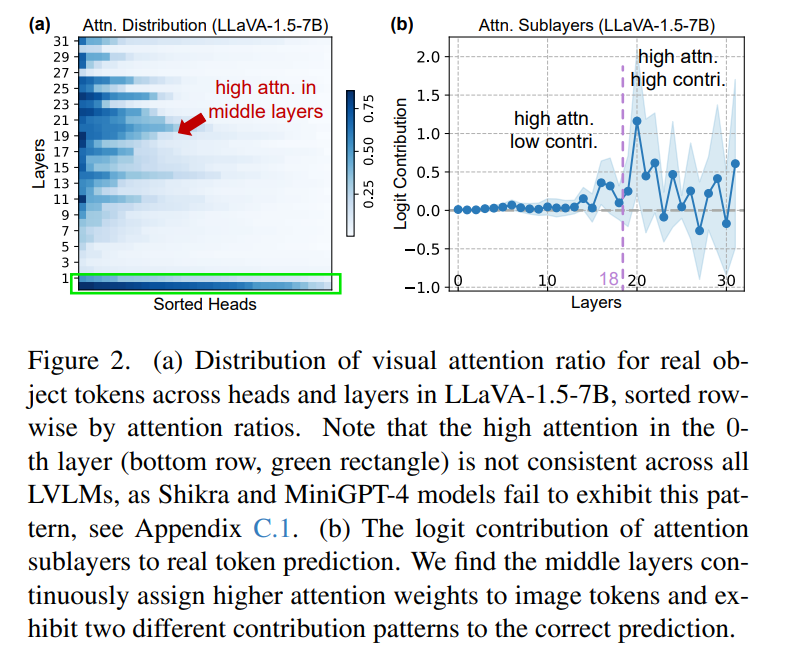 논문에서는 LVLMs의 중간 계층(Middle Layers, 5~26층)에서 시각 정보가 처리되는 과정에서 환각이 발생한다고 분석했다.