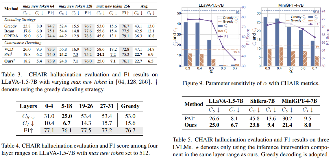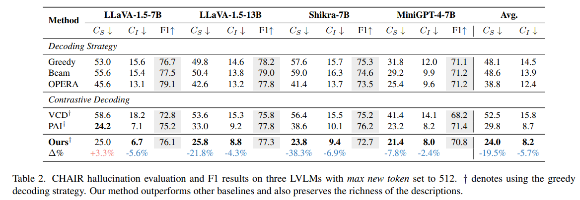 방법 CHAIR (CS, ↓) CHAIR (CI, ↓) F1 Score (↑)| Greedy Decoding | 53.0 | 15.6 | 76.7 |