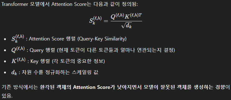 기존 방식에서는 환각된 객체의 Attention Score가 낮아지면서 모델이 잘못된 객체를 생성하는 경향이 있음.