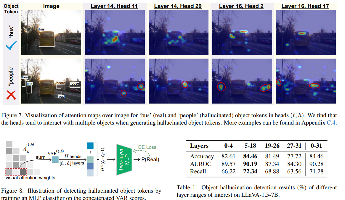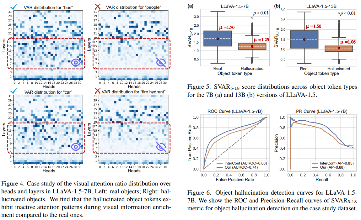 - 실제 존재하는 객체(Real Object)는 이미지 토큰에 대한 높은 Attention 값을 가지지만, 환각된 객체(Hallucinated Object)는 낮은 Attention 값을 가진다.