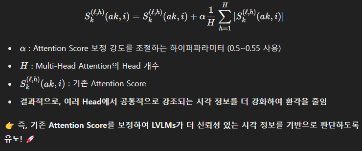 👉 즉, 기존 Attention Score를 보정하여 LVLMs가 더 신뢰성 있는 시각 정보를 기반으로 판단하도록 유도! 🚀