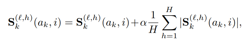 Sk(ℓ,h)(ak,i)=Sk(ℓ,h)(ak,i)+α1H∑h=1H∣Sk(ℓ,h)(ak,i)∣S^{(\ell,h)}_k(ak, i) = S^{(\ell,h)}_k(ak, i) + \alpha \frac{1}{H} \sum_{h=1}^{H} |S^{(\ell,h)}_k(ak, i)|
