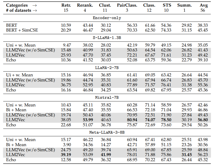 | Echo Embeddings와 비교 | - LLM2Vec는 Echo embeddings보다 더 효율적. - Echo embeddings는 입력을 반복하여 문맥을 확장하지만, 추론 시간이 2배 증가. - LLM2Vec는 입력 길이를 늘리지 않고 성능 향상 가능. |