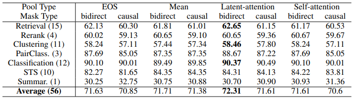 | Pooling 방법 비교 | - 기존 EOS pooling 방식은 디코더 모델에서 비효율적. - Weighted Mean Pooling이 가장 우수한 성능을 보임. |
