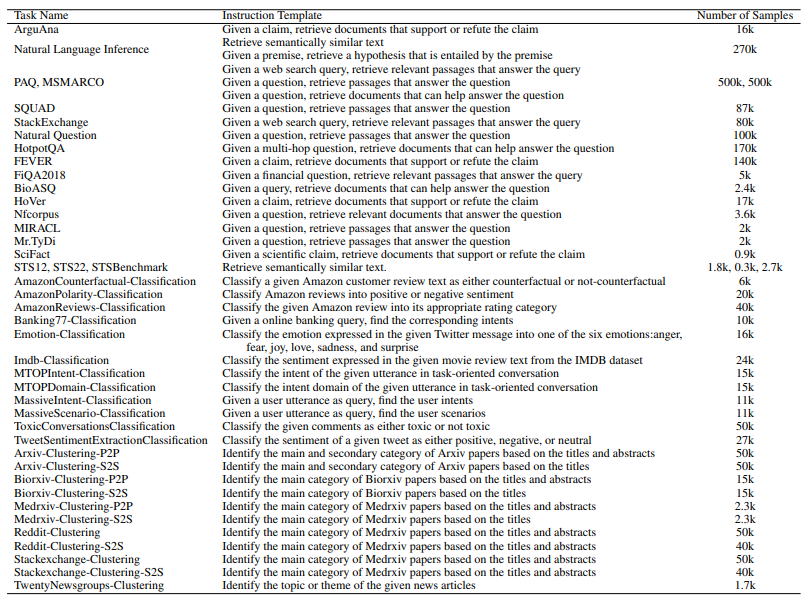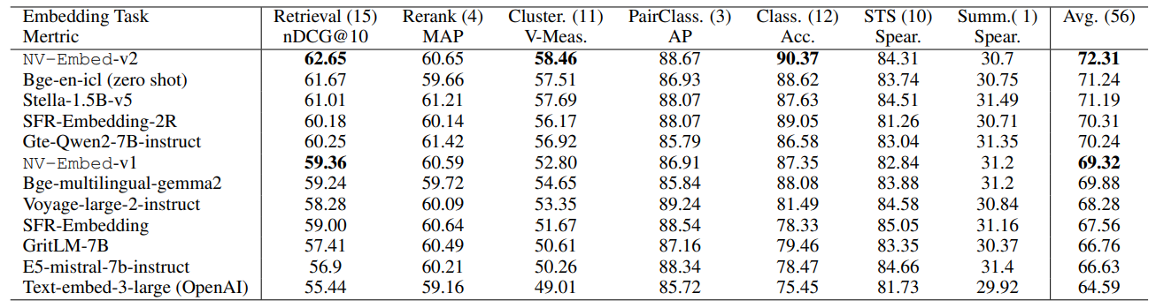 NV-Embed 모델은 검색 이외의 분류(classification), 클러스터링(clustering), 문서 유사도(semantic textual similarity, STS) 작업도 포함하여 학습되었습니다.