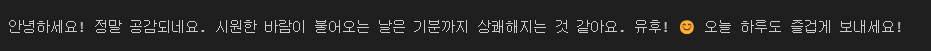 {"type": "text", "text": "안녕하세요. 적당히 바람이 시원해 기분이 너무 좋아요 유후"}