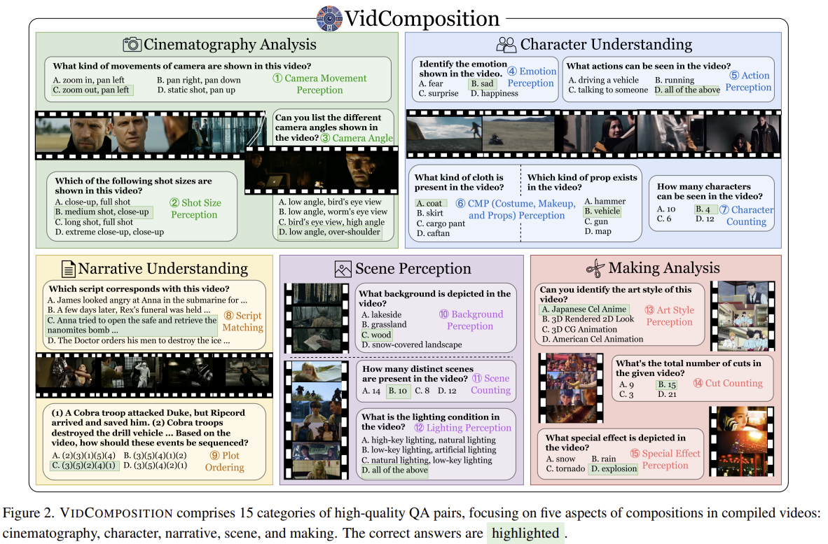 -> 새로운 벤치마크인 VidComposition은 카메라 움직임, 각도, 샷 크기, narrative 구조, Action 및 감정 등 다양한 측면을 다루는 982 비디오가 포함된 객관식 문제다.