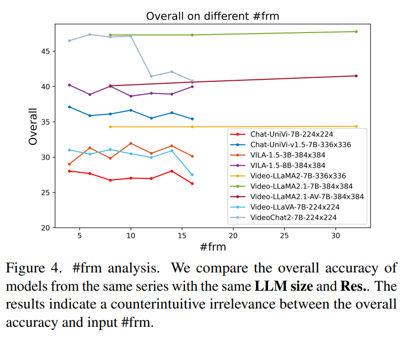 ➡ MLLM 설계 시 단순히 "더 많은 프레임을 넣는 것"보다는 해상도, LLM 크기, 데이터 다양성이 더 중요한 역할
