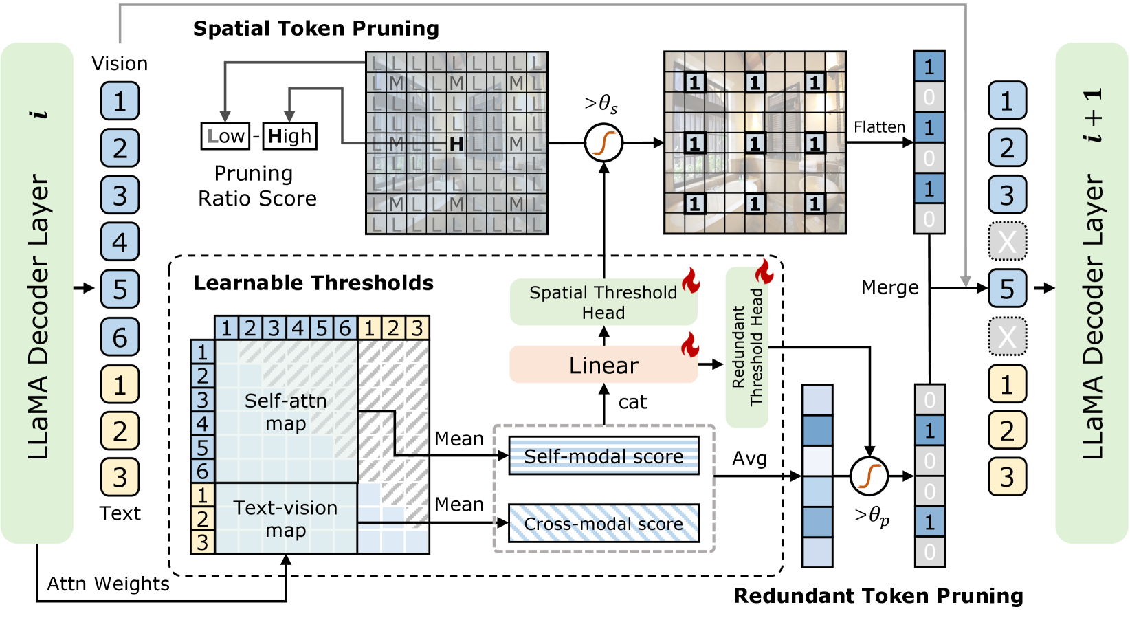 | 💡 핵심 아이디어 | Adaptive Token Pruning 모듈을 도입하여, 각 이미지/프롬프트에 따라 레이어별로 다른 프루닝 임계값을 학습해 적용 |
