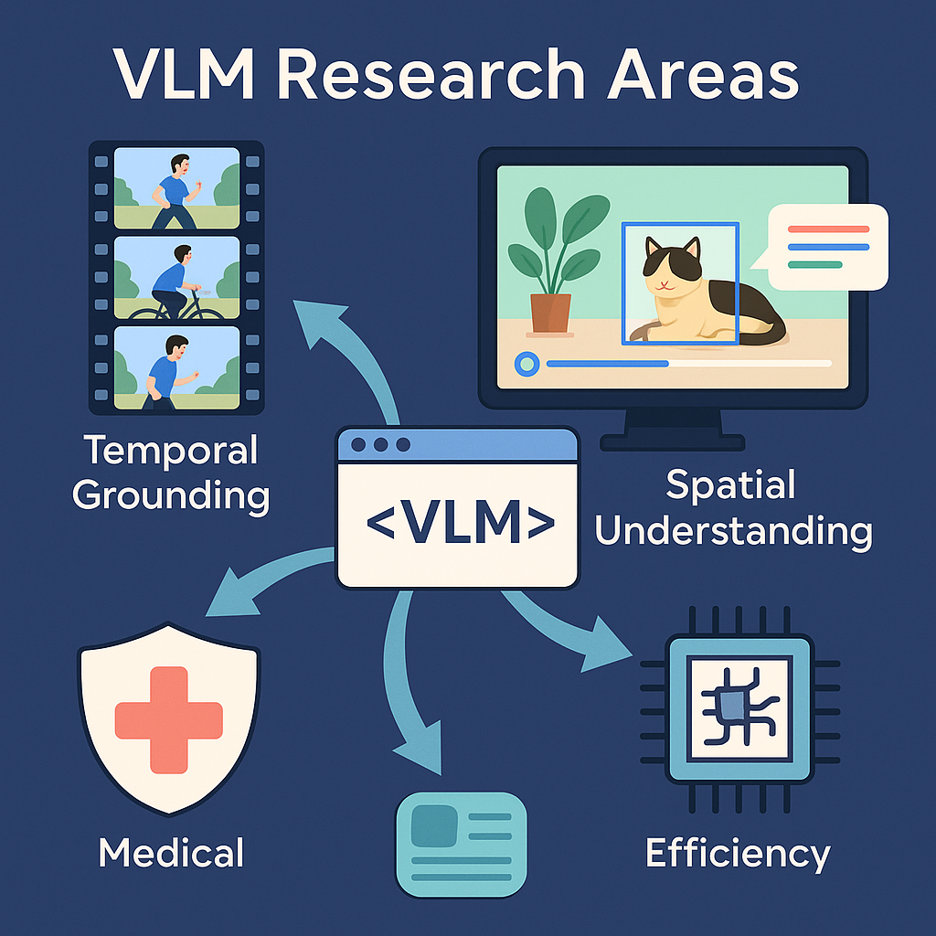 Video LLM은 짧은 비디오에 대한 캡셔닝, 질문응답, 장면 요약 등의 작업에서는 준수한 성능을 보이지만, 여전히 긴 비디오 처리, 시계열 추론, 객체 단위 정밀 인식, 실시간 대응 측면에서는 한계를 드러낸다. Seq2Time은 절대 시간 표현의 일반화 실패 문제를 해결하기 위해 상대 위치 토큰을 도입하여 시계열 데이터를 효과적으로 정렬하고, 다양한 길이의 영상에서도 시간 표현의 일반화를 가능하게 했다. DynFocus는 질문과 정합성이 높은 프레임을 선택하고 나머지는 희소 인코딩으로 처리함으로써, 효율성과 정밀도의 균형을 맞춘다. VideoTree는 시각 정보를 계층화하여 질문과 연관된 프레임만을 추출하고, reasoning 연쇄 구조에 따라 재정렬된 캡션을 문서화하여 LLM 입력으로 활용함으로써 multi-hop reasoning에도 적합하다. Hallucination은 LVLM이 실제 이미지에 없는 객체를 생성하거나, 속성이나 위치 정보를 잘못 예측하는 문제를 지칭하며, 주요 원인은 attention 불균형과 LLM의 언어 prior이다. Devils in Middle Layers는 중간 attention map을 조정하고 VAR, SVAR 등의 지표를 활용해 환각 발생 위치를 조정하여 inference 시 환각 가능성을 줄인다. Nullu는 HalluSpace라 명명된 환각 유발 표현공간을 제거하는 방식으로 모델의 언어 prior 자체를 수정하는 구조적 접근을 제시한다. Octopus는 환각의 원인이 토큰/샘플/상황별로 다르다는 점을 반영해 eye token으로 감지 후, RL 기반 정책으로 디코딩 전략을 동적으로 선택하며 실시간 제어가 가능하다. 현재 환각 평가는 VAR, logit gap 등의 지표에 의존하지만, 이는 모델 구조에 민감하고 다양한 환각 유형을 포괄적으로 분리하지 못해 향후 동적이고 세분화된 평가 체계가 요구된다. 의료 분야에서는 VLM이 전역적 설명은 가능하나 임상적으로 중요한 특정 병변, 해부학적 구조에 대한 판단 근거를 제시하지 못하는 한계가 있다. 이를 해결하기 위해 MedRegA는 region-level 기반 attention 및 chain-of-thought 추론 구조를 도입해 시각적 근거를 명시적으로 드러내며, 의료 보고서 생성에서의 해석 가능성과 신뢰도를 높인다. MMed-RAG는 영상 입력으로 도메인을 자동 식별한 후, 해당 도메인에 특화된 retriever로 관련 지식을 검색하고, adaptive-k 전략과 preference fine-tuning을 통해 정합성 높은 응답을 생성한다. 다만, retriever 구축 비용과 도메인 간 전이, noisy retrieval 대응 등은 여전히 과제로 남는다. SERSAL은 LLM이 제공하는 언어 지식을 small model과 상호 주고받으며 self-prompting 방식으로 tabular 예측을 수행하고, 수학적으로 둔감한 LLM의 한계를 보완한다. 효율성 측면에서는 FastVLM이 FastViT 인코더를 활용해 기존 ViT 대비 3배 이상의 속도로 추론이 가능하면서도 VQA 등에서 95% 이상 정확도를 유지하며, 고해상도 입력 처리에 유리하다. 그러나 fine-grained task에서는 해상도 손실에 따른 의미 왜곡 우려가 있다. PVC는 프레임 중복을 제거하며 영상 요약 기반 작업에 효율적이며, ATP-LLaVA는 레이어 및 인스턴스 기반으로 중요 토큰을 선택해 연산량을 줄인다. VLsI는 대형 모델의 추론 경로를 distill하여 작은 모델로 재구성함으로써 edge 환경에 적합한 reasoning이 가능하도록 한다. 이 방식들은 task 유형에 따라 트레이드오프가 존재하므로 hybrid 구조 구성이 바람직하다. FlashSloth는 contrastive selection 기반으로 salient region만 추출하고 연산량을 줄이는 동시에, 선택된 토큰들이 explainability의 시각적 근거로 기능할 수 있어 모바일 환경에서의 신뢰성 향상에도 기여할 수 있다. Hallucination 문제를 다룬 주요 연구들은 각각 다른 접근 방식으로 환각의 원인을 규명하고 이를 완화하려고 시도한다. (Devils)에서는 대부분의 기존 연구가 언어적 편향에 집중하며 시각 정보의 처리 과정은 간과하고 있다는 문제의식에서 출발한다. LVLM의 중간 레이어에서 시각 정보가 어떻게 처리되는지를 분석하였고, 이를 시각 정보 축적 단계와 의미 정제 단계로 구분하여 설명한다. 이들은 Attention Lens 기법을 활용해 중간 레이어에서 VAR, SVAR 메트릭으로 환각 가능성이 높은 토큰을 탐지하며, inference 단계에서 attention을 조정하여 효과적으로 환각을 줄이는 방법을 제안한다. 외부 모델 없이 내부 attention만으로 조정 가능한 경량 구조라는 점에서 실용성이 높으나, SVAR 민감도 저하와 단계 구분의 주관성이 한계로 지적된다. (AG&LA)은 LVLM이 이미지의 global 특징에는 집중하지만 질문에 관련된 지역 정보를 놓쳐서 실제 존재하지 않는 객체를 생성하는 문제를 지적한다. 이에 따라 global과 local attention을 결합한 logit fusion을 통해 질문과 관련된 시각 영역에 집중하도록 유도하며, 학습 없이 plug-and-play 방식으로 적용 가능한 구조를 제안한다. 다만, GradCAM 기반 시각 정보 해석의 한계와 대규모 모델로의 확장성은 제한적이다. (Nullu)은 환각의 원인이 데이터 부족이 아니라 LLM 내부의 강한 문장 생성 prior에서 비롯된다는 점을 이론적으로 규명하고, 이를 해결하기 위해 HalluSpace라는 환각 유발 하위 표현 공간을 찾아내고 이를 제거하는 방식으로 접근한다. 모델 파라미터를 직접 수정하여 학습 없이 환각을 억제할 수 있으며, 일반 LVLM에 플러그인 형태로 적용 가능하지만 HalluSpace 정의 및 하