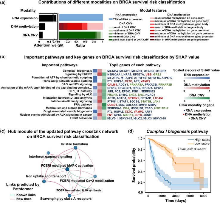 | 해석 가능성 | - SHAP 기반으로 주요 경로/유전자/오믹스 modality 식별 - 실제 알려진 유방암 유전자와 일치 (ex. Complex I Biogenesis, MT-ND*) - pathway crosstalk network를 업데이트하여 허브 경로 네트워크 시각화 가능 |