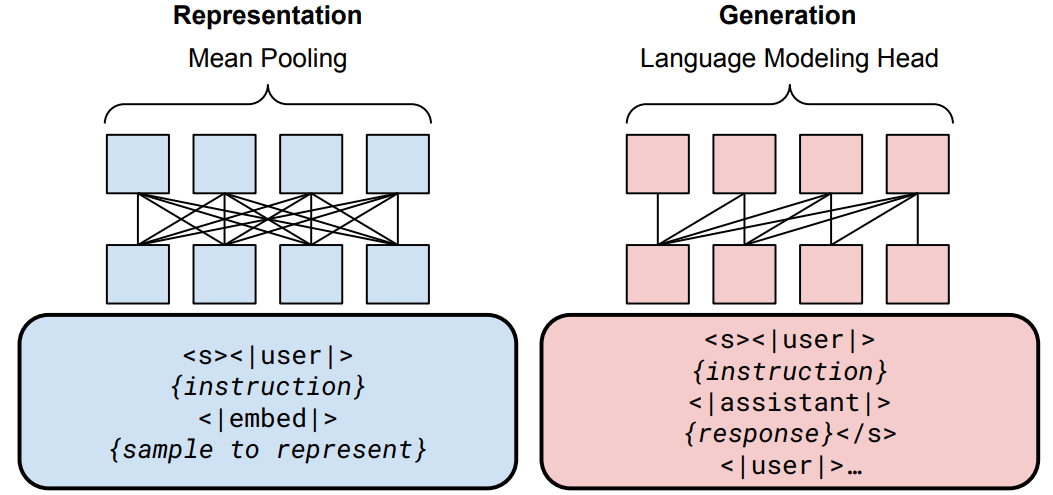 https://arxiv.org/abs/2402.09906 기존 모델들은 생성만 잘하거나, Embedding만 잘 진행하였습니다.그리하여 둘 다 잘 하도록 두개 다 학습을 진행한 GRIT이 등장합니다.생성과 Representation 모두 진행하여 학