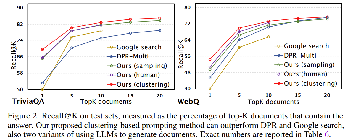 | Recall@K | 클러스터 기반 프롬프트가 가장 높은 정답 포함률 (TriviaQA, WebQ에서 Google Search, DPR 초과) |