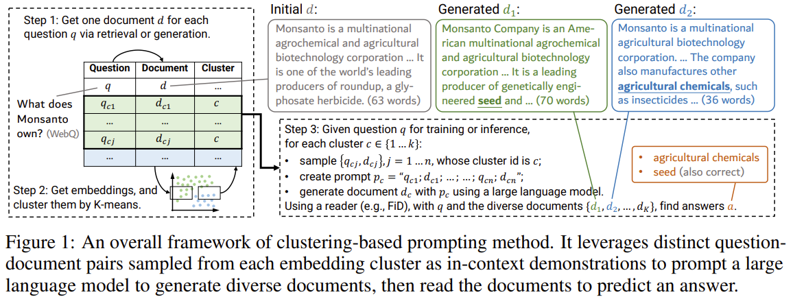 | 핵심 기법 | ① 문서 생성 (Step 1) ② 정답 추론 (Step 2) ③ 다양성 확보 위해 클러스터 기반 프롬프트 설계 |