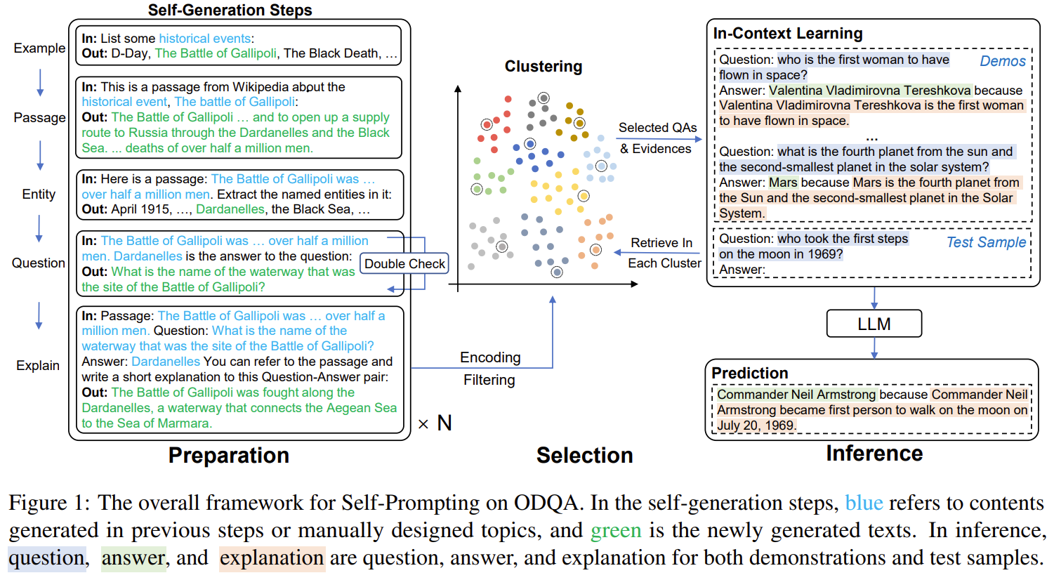 | 💡 제안 방법 (Method) | Self-Prompting 프레임워크 → LLM이 스스로 QA 데이터를 생성하고 그것을 기반으로 in-context learning 수행 ① Preparation 단계 (LLM 자체 데이터 생성): ‣ Wikipedia-style passage 생성 ‣ Named Entity 추출 → 정답 후보 ‣ 질문 생성 + 정답 확인 ‣ 한 문장 explanation 생성 ② Inference 단계 (추론): ‣ Sentence-BERT + k-means 기반 클러스터링 ‣ 각 클러스터에서 가장 유사한 QA 예시 1개씩 추출 ‣ Q→A→Explanation 포맷으로 in-context 입력 구성 |