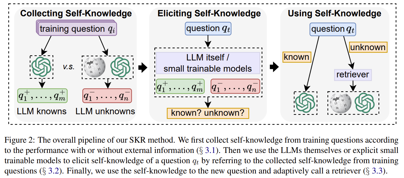 Self-Knowledge guided Retrieval(SKR)을 통해 자기가 아는지 모르는지를 판단하게 하여 외부 지식이 필요한 질문에만 Retrieval을 수행하자!
