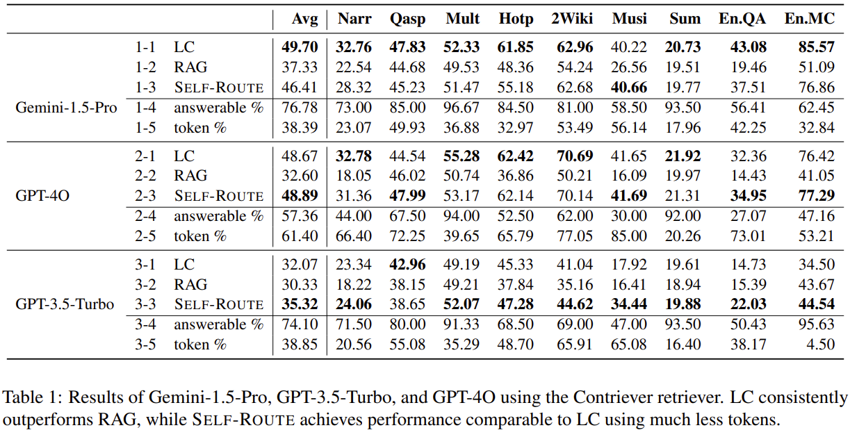 | 방법론 | - LC vs RAG 정량 비교 실험 (LongBench, ∞Bench, 3개 LLM) - SELF-ROUTE 제안: LLM이 스스로 해당 질문이 RAG로 가능한지 판단하여 RAG 또는 LC로 분기 → “unanswerable”이라고 판단되면 LC 사용 |