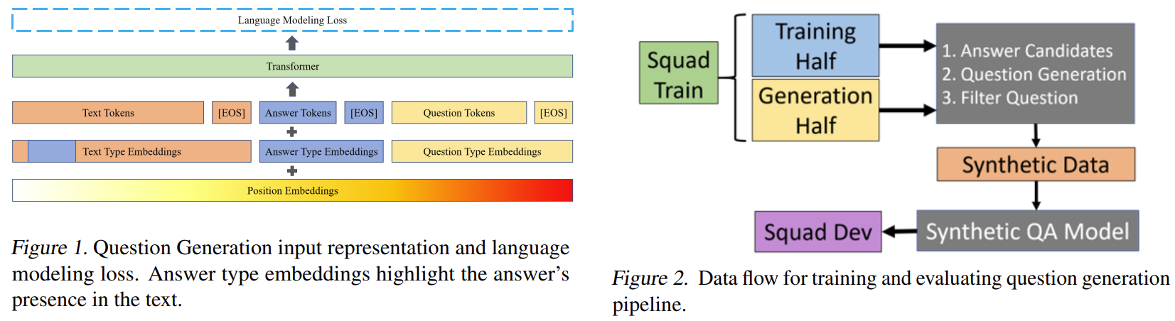 | 방법론 개요 | 대형 언어 모델(GPT-2, BERT 등)을 활용하여 다음과 같은 3단계 파이프라인을 구성함: 1. Answer Generation: BERT 기반 모델로 문장에서 정답 후보(span) 생성 2. Question Generation: GPT-2 기반 모델로 정답과 문맥을 기반으로 질문 생성 3. Roundtrip Filtration: QA 모델로 질문을 다시 풀어 원래 정답과 일치하면 유효한 QA쌍으로 간주 |