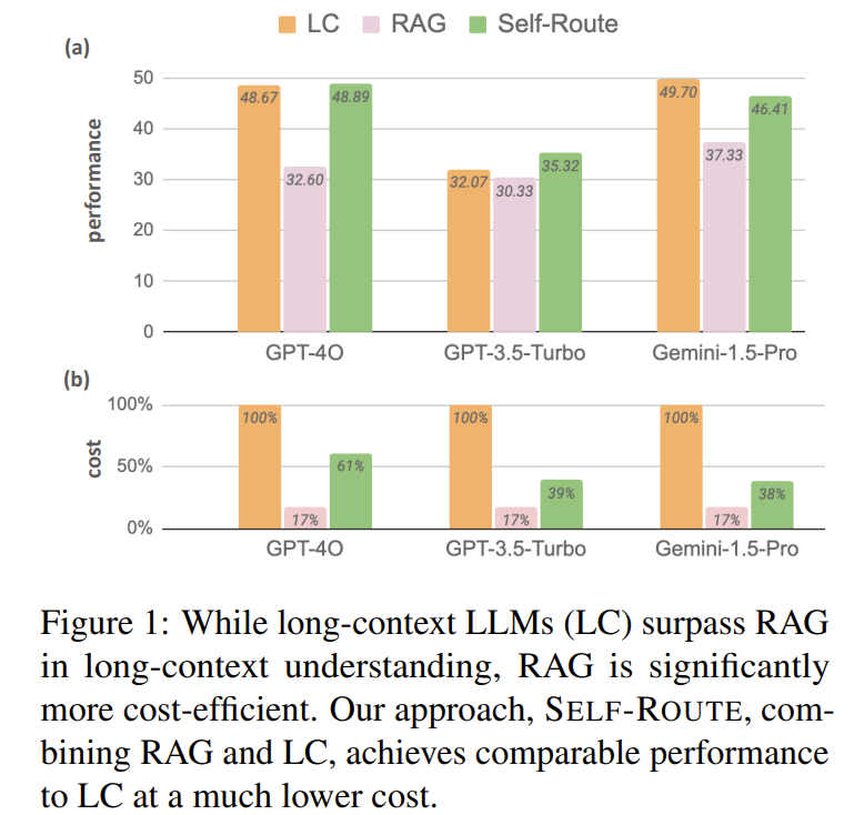 | 문제 상황 | 기존 RAG는 긴 문맥을 LLM이 처리할 수 없을 때 효율적이었지만, 최근 LLM (예: GPT-4, Gemini-1.5)이 수십만~백만 토큰의 문맥을 직접 처리할 수 있게 되며, RAG vs Long-Context LLM (LC)의 성능 및 비용을 비교할 필요가 생김. |