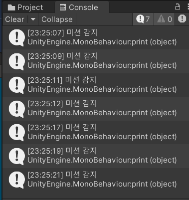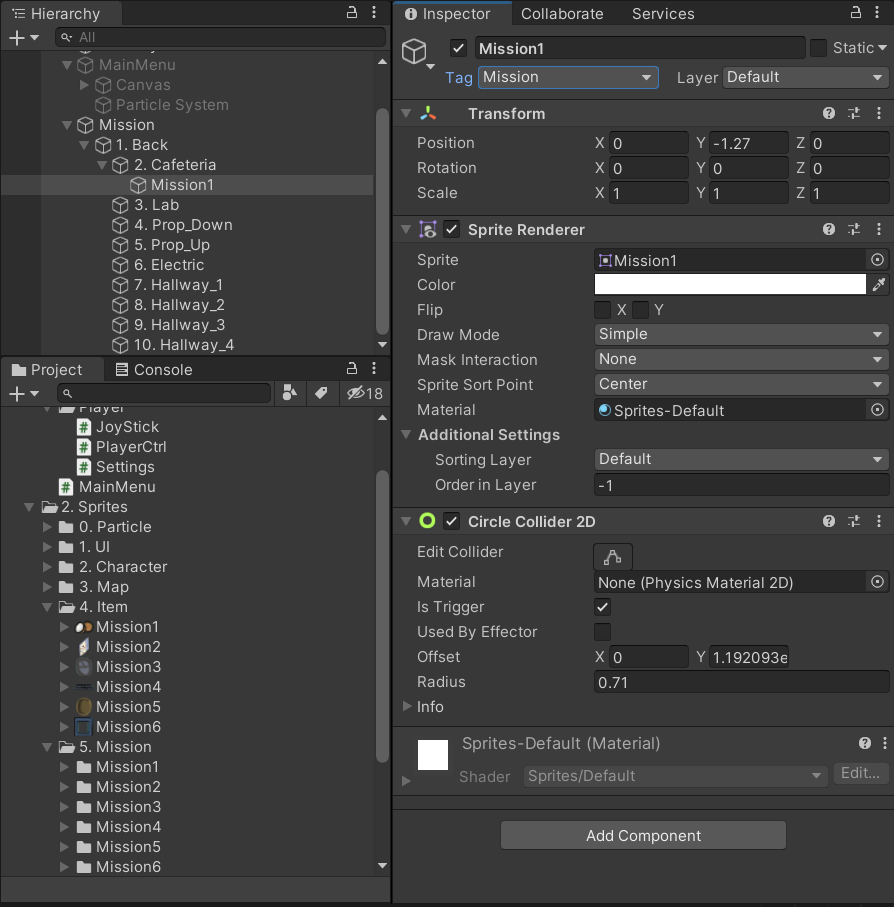 이번엔 trigger를 체크하여 저 콜라이드는 트리거일 뿐 넘지 못하는 것은 아니고, 전체적인 레이어를 다시 조정해줬다. 그리고 태크 또한 추가해줘서 미션으로 테그 해놨다. 이제 구현하자 코드!