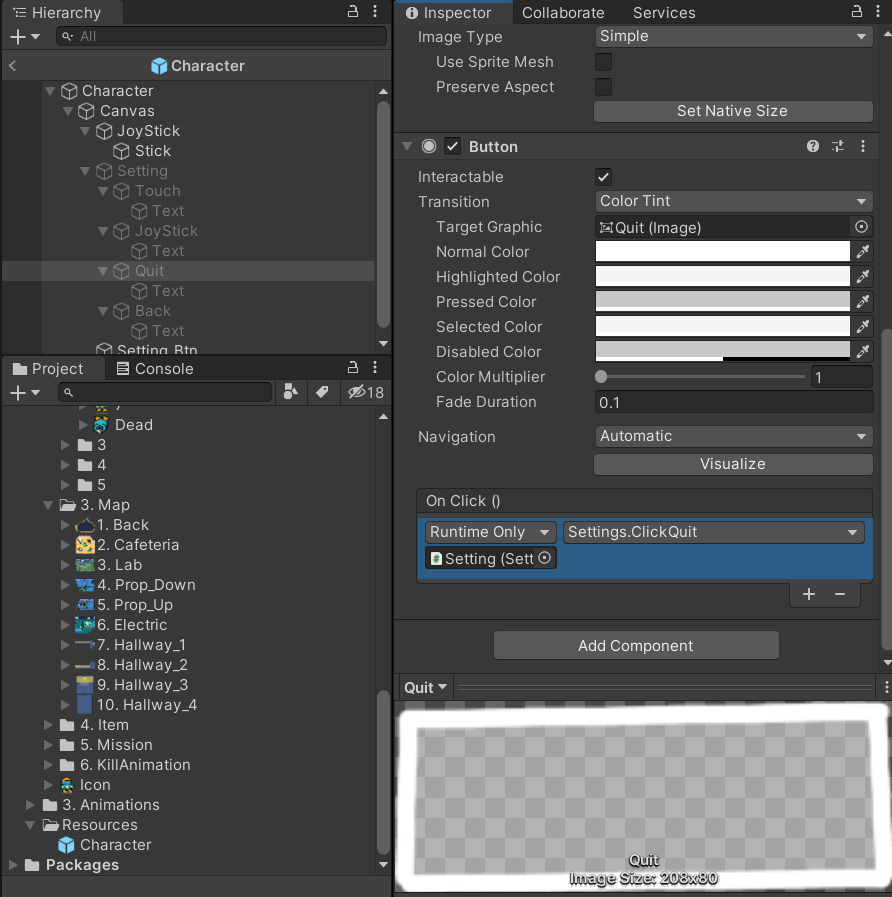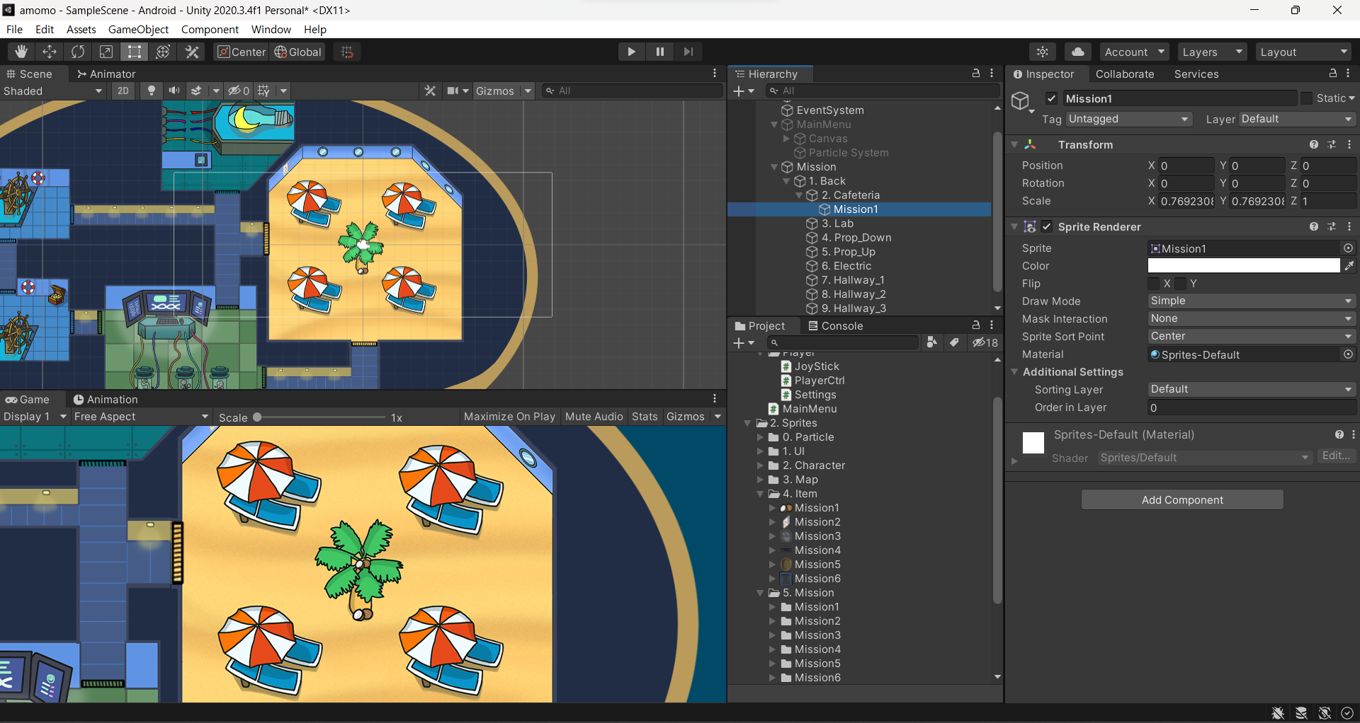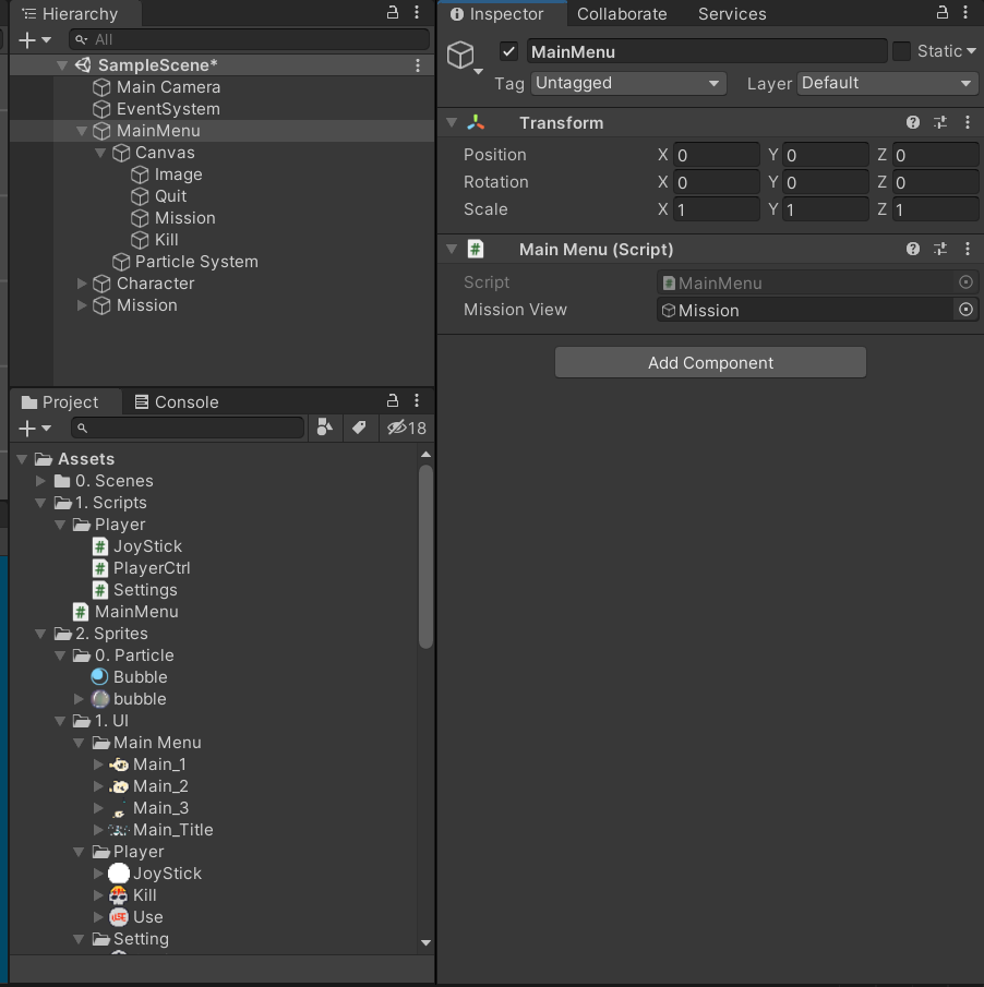 위와 같은 코드로 mainmenu script를 수정하여 실행해보면 미션버튼이 잘 작동하고, 캐릭터도 야자수에 끼지 않게 된다