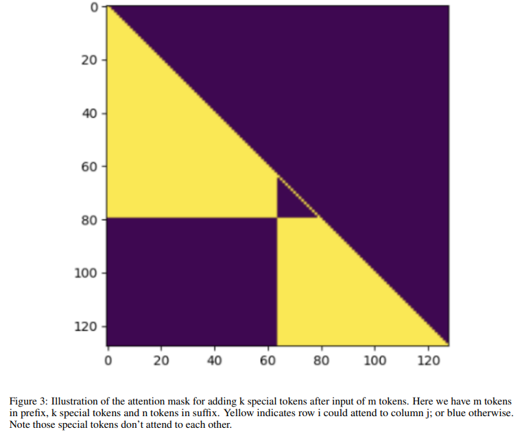 | 가운데 가로 줄 (special token 행) | special token이 prefix는 볼 수 있음 → 정보를 압축해서 받을 수 있음 |
