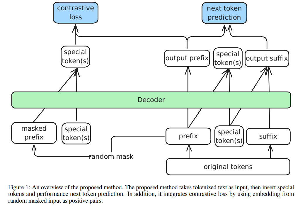 | 학습 방법 | - 입력 문장 일부에 확률적으로 special token 삽입(p) - prefix + special token + suffix 구조로 입력 - suffix는 prefix를 볼 수 없게 attention mask 구성 - dropout된 prefix와 원본 간 contrastive loss로 임베딩 정제 - loss 함수: L = (1 - α) * L_NTP + α * L_CL |