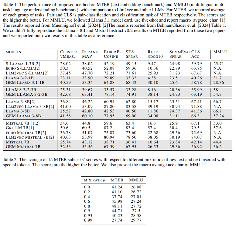 | 비교 실험 | - LLM2Vec: MTEB 성능은 우수하지만 text generation capability 완전히 손실 - GritLM: 성능 우수하지만 많은 데이터와 구조 수정 필요 - GEM: 적은 데이터, 구조 변경 없음으로 유사한 성능 |