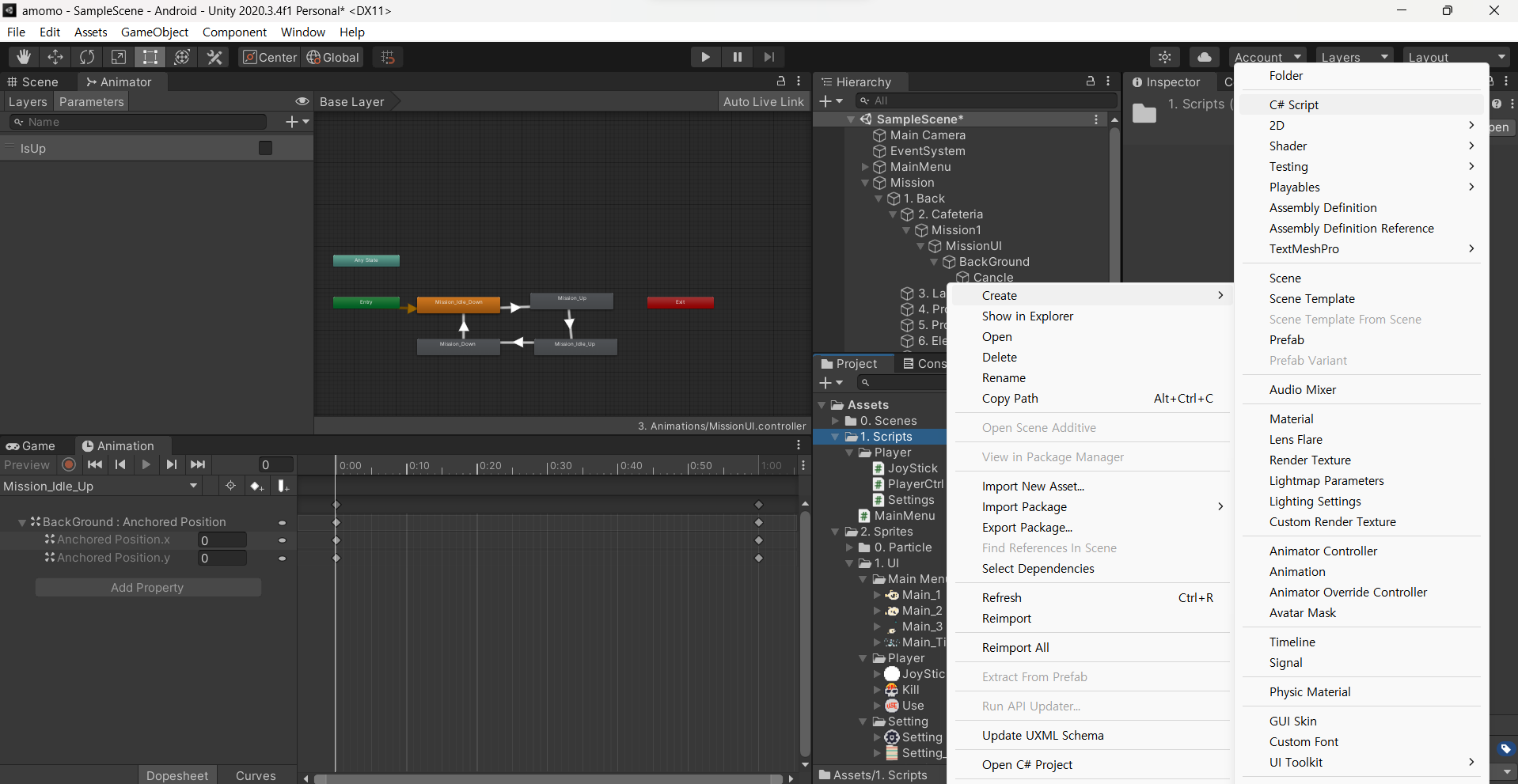 이 후 다른 것에선 별다른 수정없이 새로운 스크립트 Mission1을 만들어 준다.