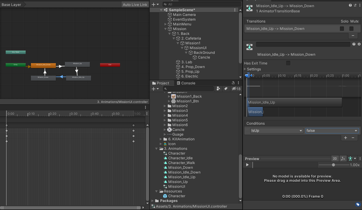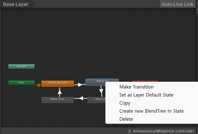 그리고 Mission_Idle_Down과 Mission_Up를 이어주는 화살표를 클릭하여 설정을 위 사진 오른쪽과 같이 해준다.