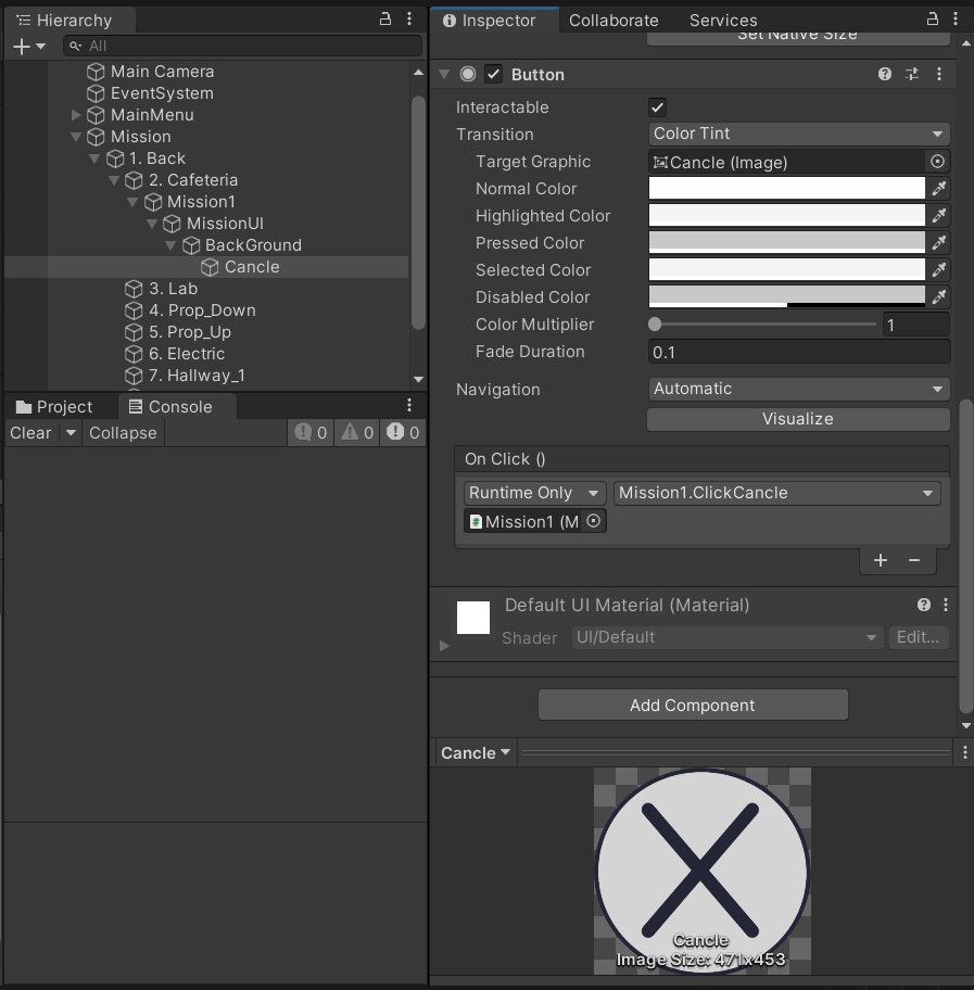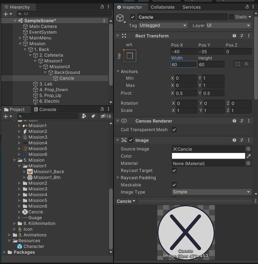 그리고 BaclGround안에 버튼을 또 만들어주고 이름은 Cancle이다.