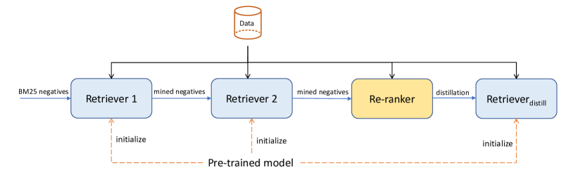 - Retriever1로 하드 네거티브를 마이닝하여 동일한 대조손실로 재학습.