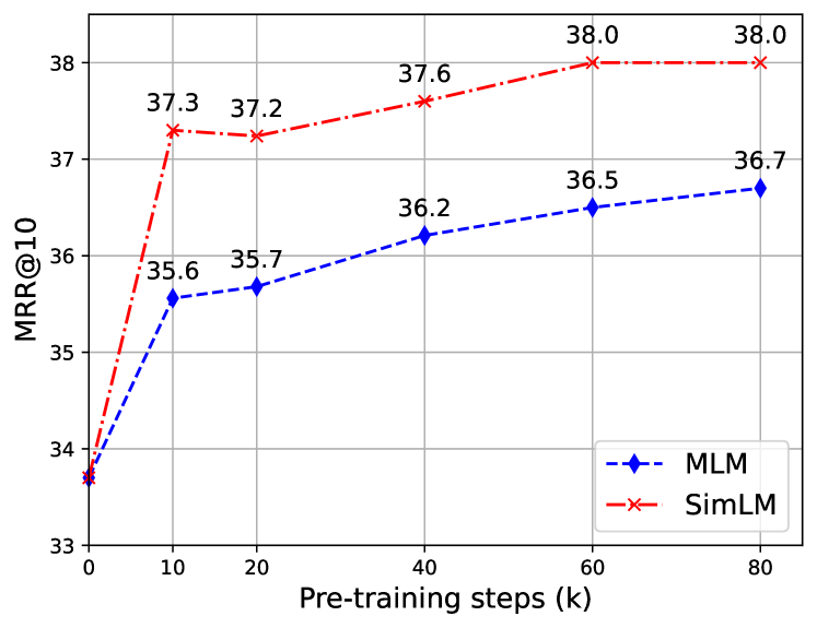 - 사전학습 목표 비교: Enc-Dec MLM(=SimLM)가 Enc-Dec RTD/Condenser/AE 등 대비 최고 MRR@10 38.0.